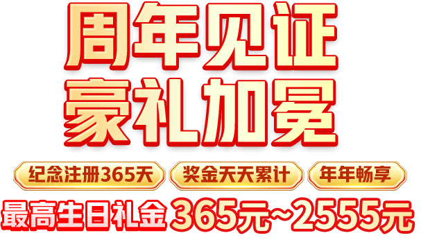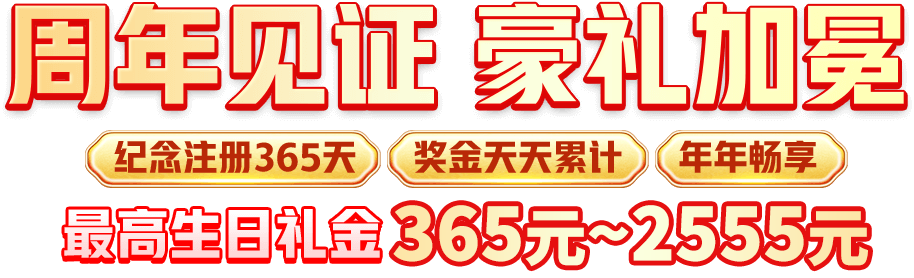 周年相伴,感恩有您!无论您是哪一年注册的,我们珍视每一位会员的陪伴。为纪念您的专属注册周年,我们特别献上豪华礼金回馈!根据您的VIP等级,生日礼金可达 365元~2555元,让您的周年更添喜悦!在您的注册周年当天,联系客服即可申请,礼金即时到账,轻松领取专属福利!感谢您的支持,祝您财富倍增,畅享尊贵礼遇!